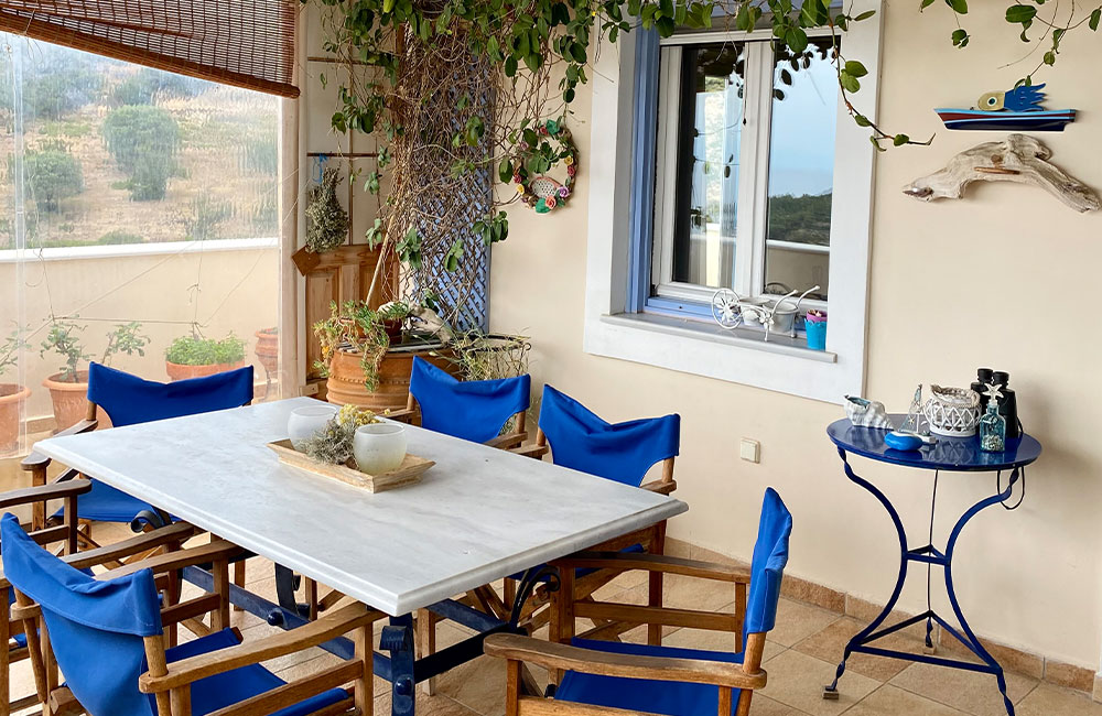 Step outside to discover a beautifully landscaped garden, adorned with vibrant Mediterranean flora, where children can play and adults can unwind. The outdoor terrace, perfect for alfresco dining, offers stunning views of the surrounding hills and the sparkling Aegean Sea.